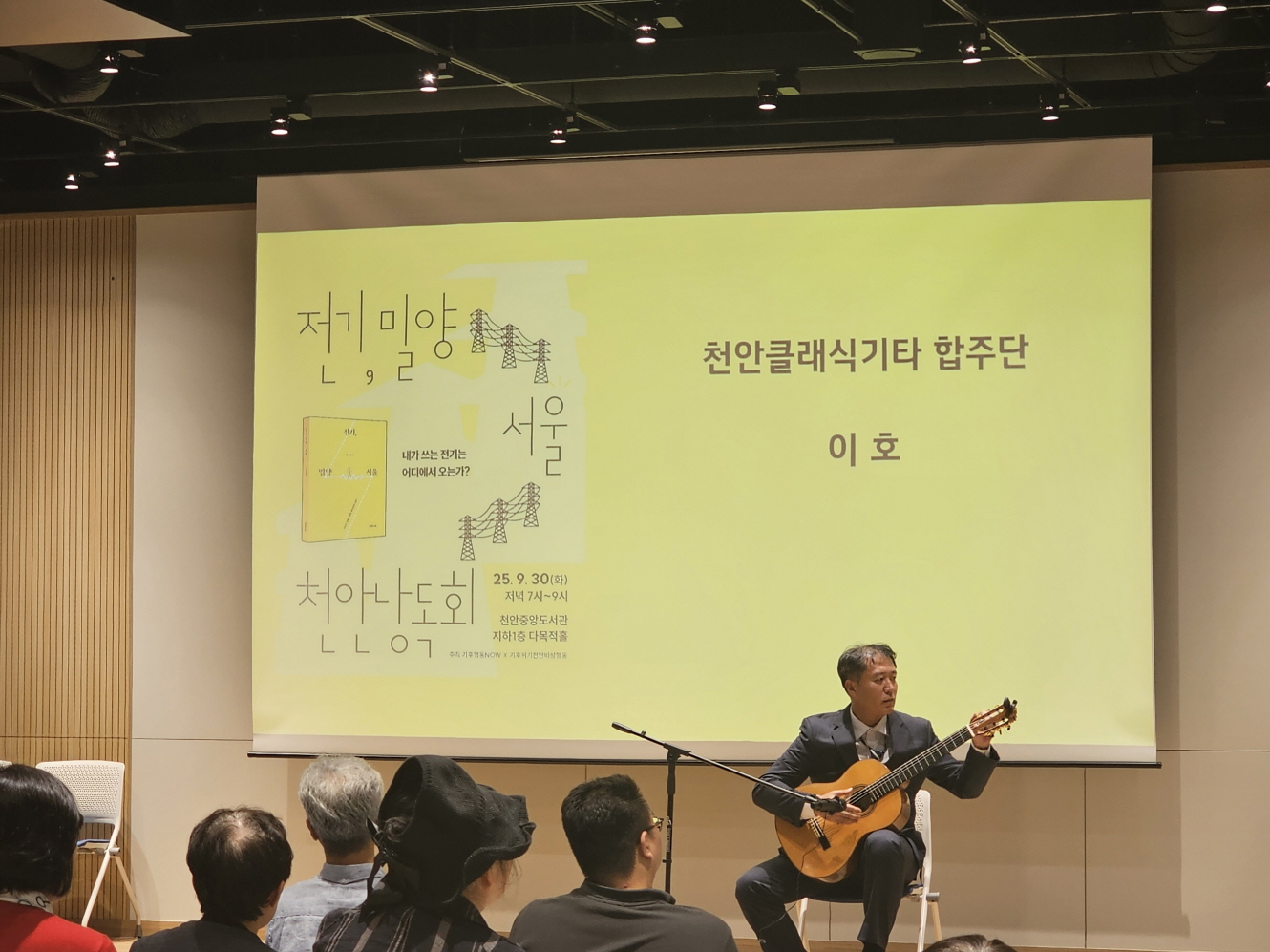 첫 순서는 천안 클래식기타 합주단의 이호 님의 아름다운 클래식 기타 연주로 시작하였습니다. 오늘 낭독회 연주에 참여하기 위해서 직장에서 일찍 퇴근하고 오셨다고 하네요! 아름다운 기타 연주를 들으며 편안한 마음으로 <전기, 밀양-서울> 천안 낭독회를 열었습니다.