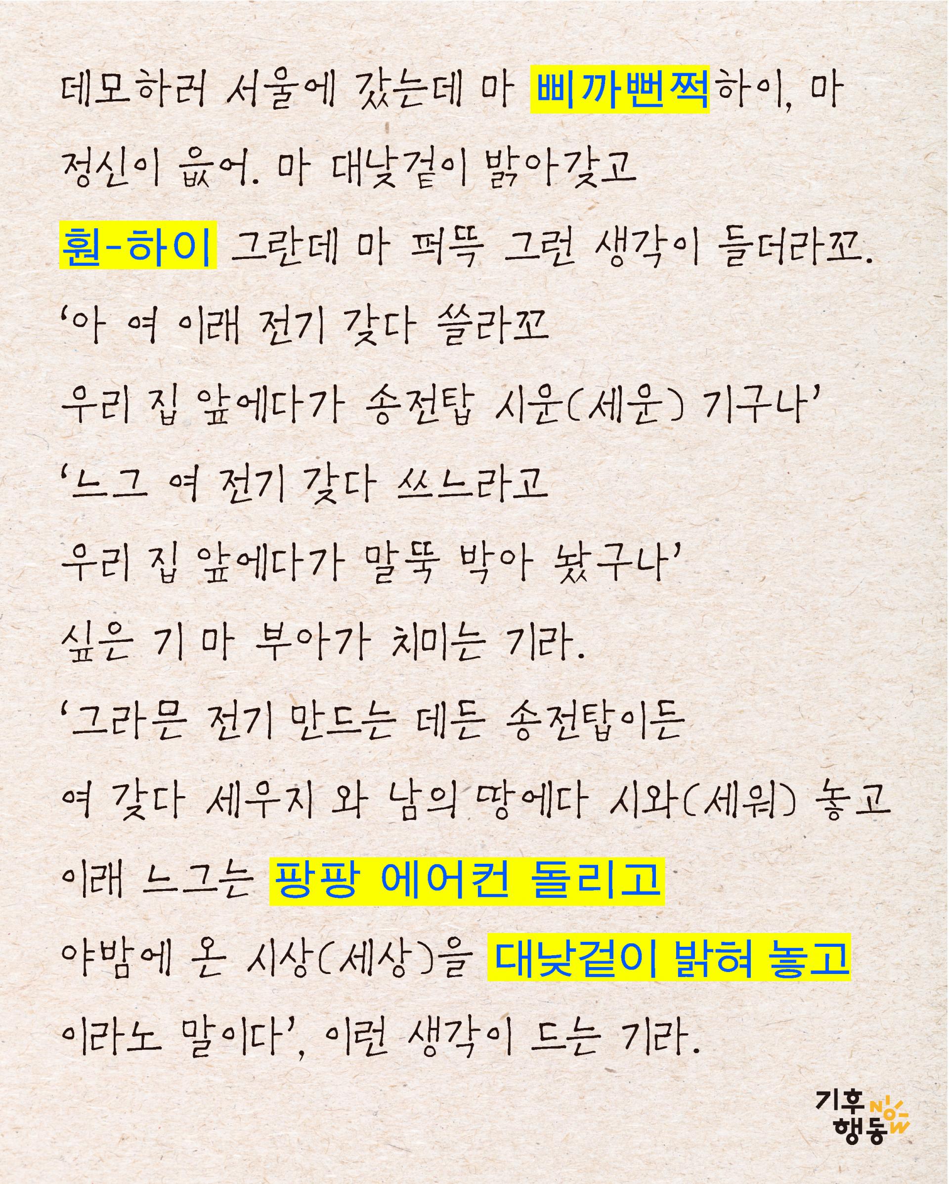 밀양 어르신들은 자기 집앞에 어떤 사전 설명도 없이 들어서며 설명 대신 돈으로만 강제했던 한전에 맞서 송전탑 건설에 반대하며 10년이 넘는 시간을 보내며 공부하고 전국을 다녔습니다. 그리고 이 송전탑을 필요로 하는 이유가 지역을 식민화하여 전기를 많이 사용하기 위한 지역 불균형과 현재 전기가 충분함에도 원전(핵발전소)을 추가로 건설하기 위함을 알게 되었습니다.